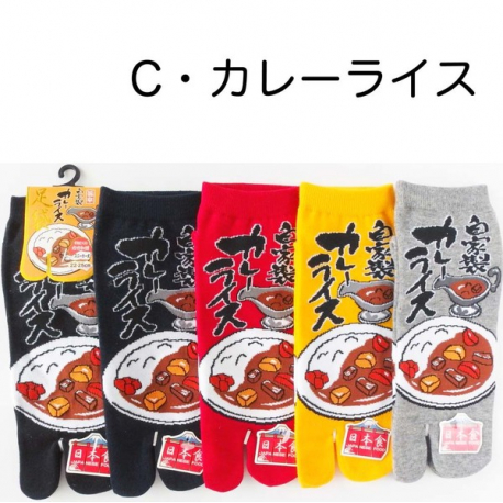 足袋 Soquettes à orteil japonaises pour zori, geta, tongs et sandales ou pour tenir plus chaud en hivers ! Extensibles, elle taille du 39 au 44 (25 à 28cm en taille japonaise) Motif RiZ au CURRY カレーライス. 5 coloris disponibles.